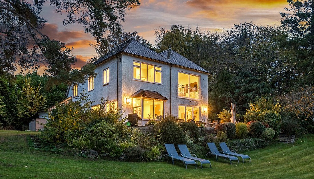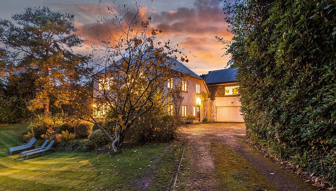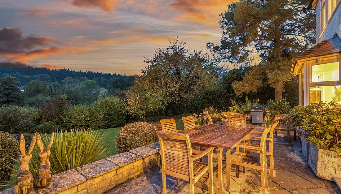 The grounds are a true highlight - around two acres of beautifully landscaped gardens that feel wonderfully private. Sweeping lawns and terraces are framed by mature trees and shrubs, including a magnificent magnolia tree, towering pines and striking rhododendrons. The south-facing main terrace is sheltered and sun-drenched, providing an ideal spot for alfresco dining or simply relaxing outdoors. A gate from the garden leads into the paddock, where a small stream meanders through, and there's a separate access gate from the lane.