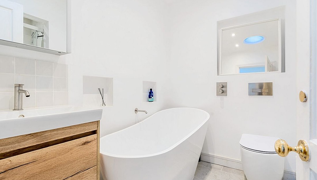 There are three further double bedrooms in the main house, each light, private and beautifully presented, plus a modern family bathroom with both bath and separate shower.