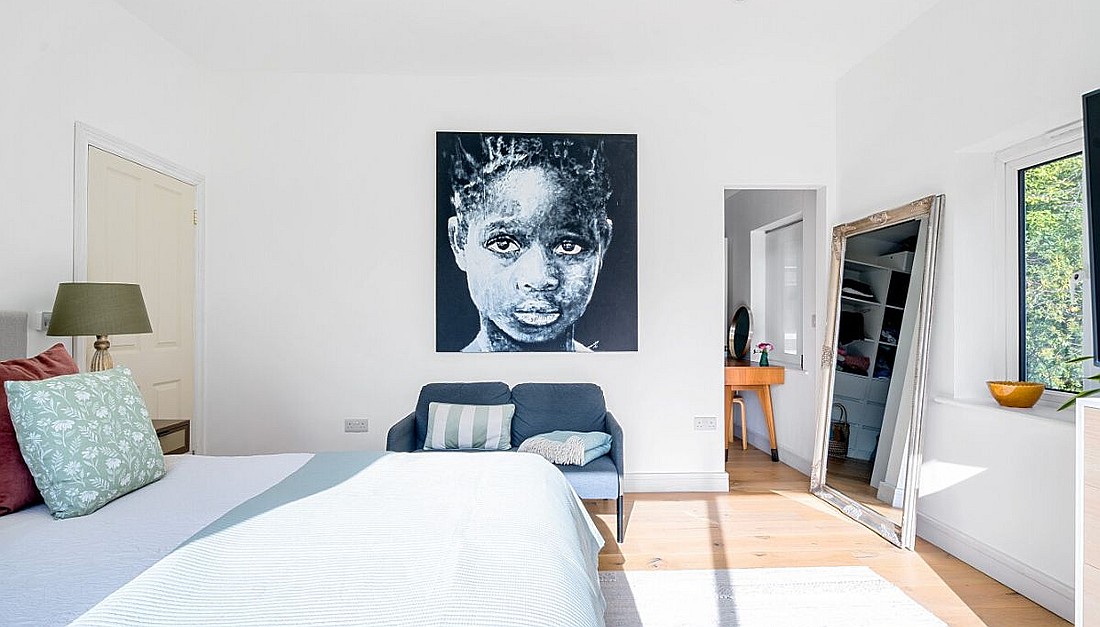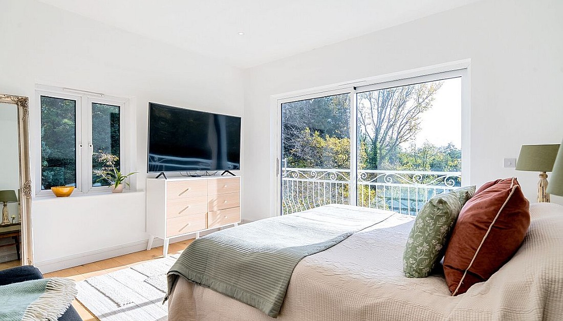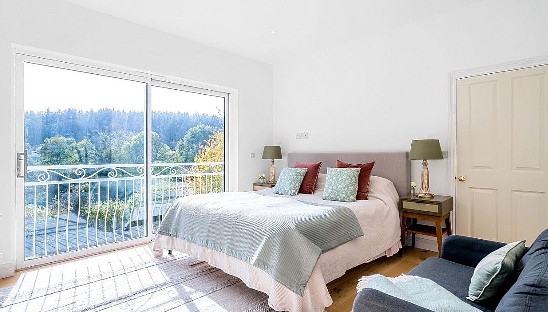 The principal bedroom suite is south facing with far-reaching views across the gardens, paddock and towards Longleat Forest. Full height sliding doors open to a Juliette balcony, making the most of the incredible outlook and filling the room with natural light. The suite includes a generous dressing room and a luxurious en suite with a monsoon rain shower and dual wall-mounted fittings - all finished to a sleek, contemporary standard that feels calm and refined.